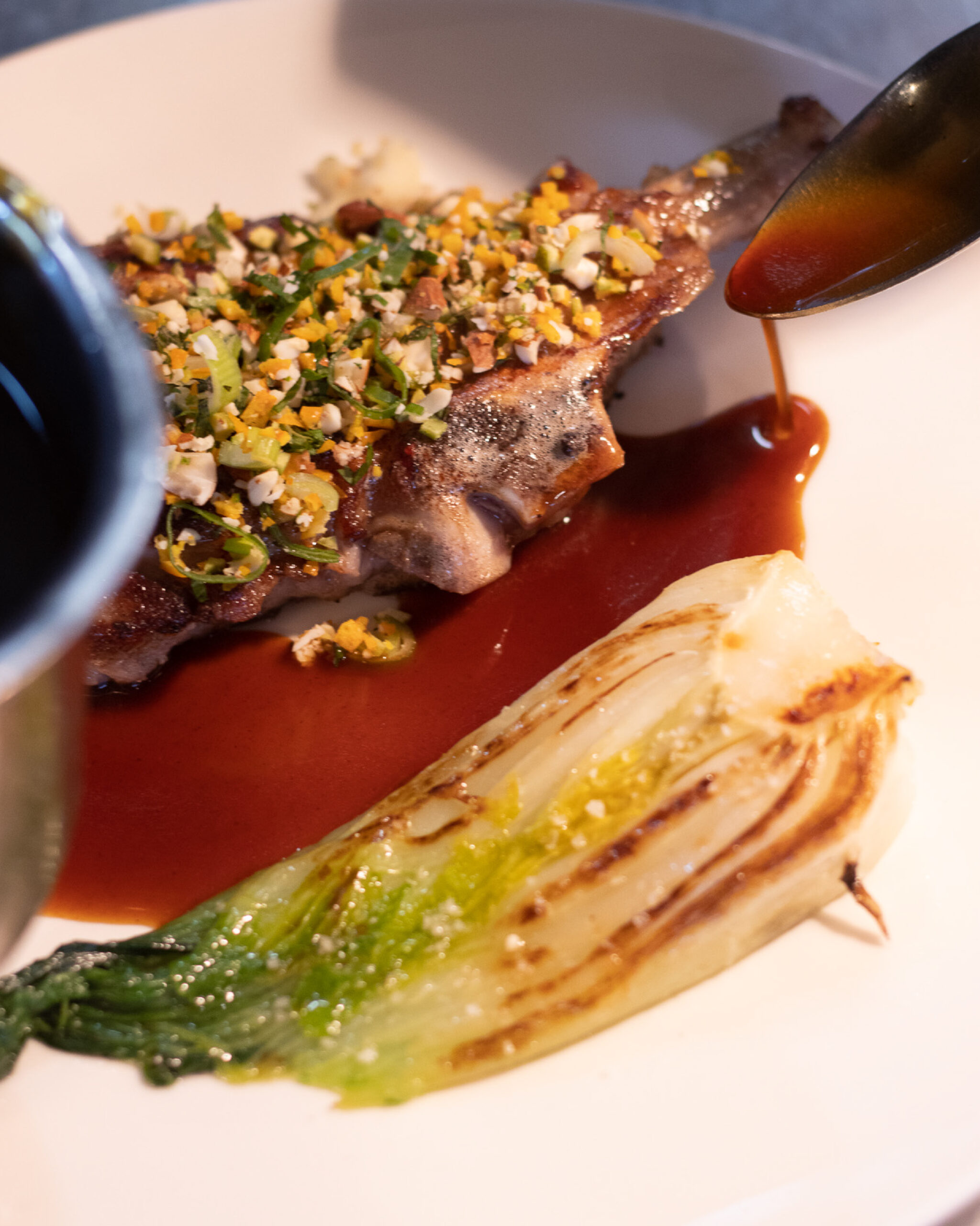 Filet d’agneau rôti & poitrine confite snackée